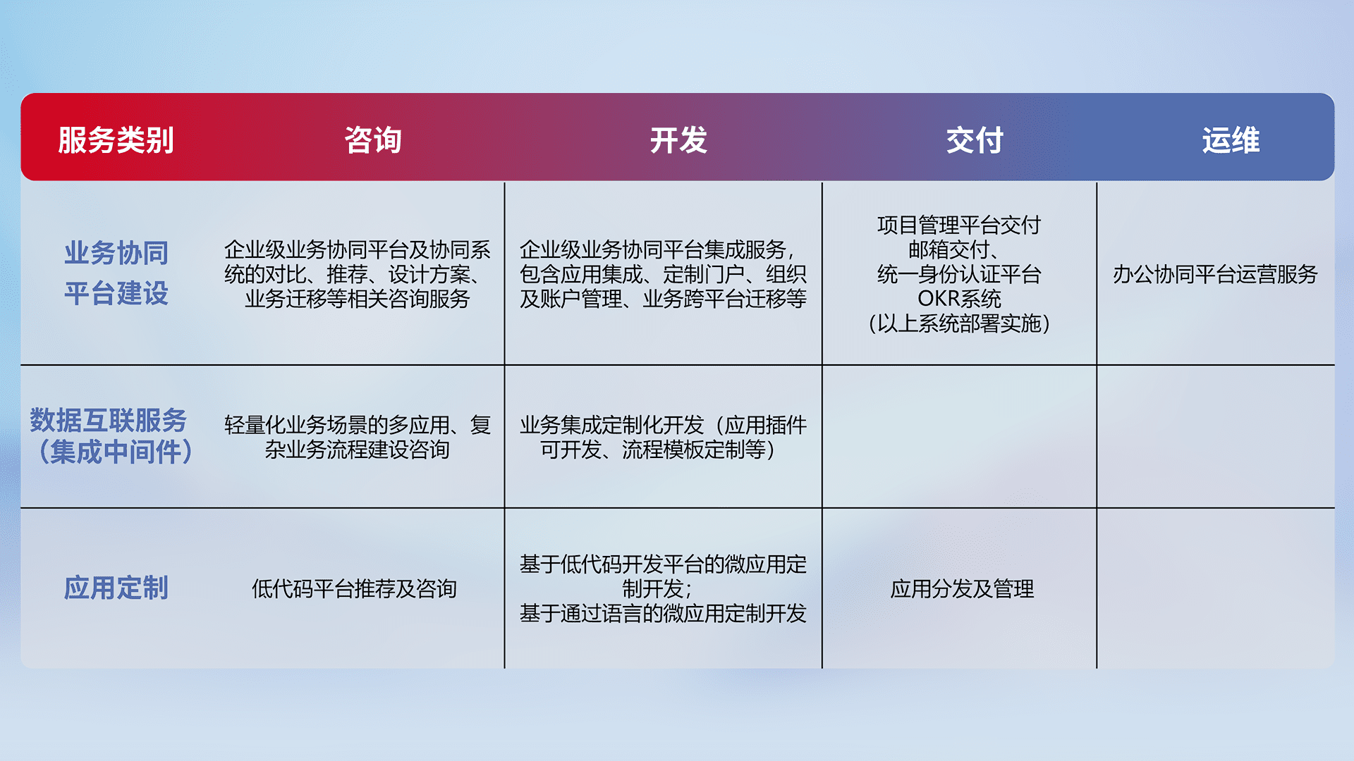 针对钉钉、、、企微、、、、IDaas等平台级产品提供产品的规划、、方案、、交付、、、定制化开发等服务,,,,实现如统一协同办公、、、智能客户服务、、混合会议管理、、、、智能数据查询、、等业务场景,,实现数字化转型。。。